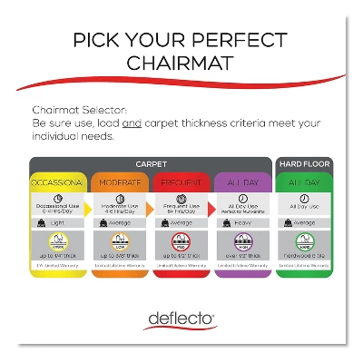 - For occasional office use on carpets up to 1/4″ thick, Low Pile/Commercial Grade. Choose a higher pile chair mat if daily usage is over 4 hours. Studded bottom surface for superior gripping power on carpets.