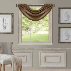 - Provides elegant silk look and room darkening benefits. Waterfall valance features scalloped decorative trim and a beautiful drape.