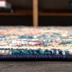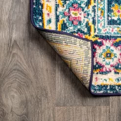 This rug’s jewel colors and rich pattern add a Bohemian touch to your modern loft, farmhouse or cottage. With its kid-friendly busy pattern, this rug is ideal for a kitchen, living room, den, bedroom or entry. A deep blue, geometric central medallion, surrounded by bold color accents gives this rug standout style.
