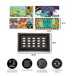 Welcome style to your doorstep with this beautiful mat set. These durable and vibrant doormats make decorating year round a breeze! Sassafras mats are constructed of durable rubber for a non-slip grip and extra protection against the elements. Now you can get a stunning seasonal selection of these top sellers in one convenient set. Includes four interchangeable mats and our signature mat tray. Each mat measures 10 x 22 inches. Mat tray measures 18 x 30 inches.