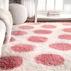 Create a warm cozy environment with this polka dot shag area rug! This floor covering is made from durable soft synthetic fibers that are perfect for your nursery, playroom, or bedroom. With a playful pink polka dot pattern, this rug adds a pop of color and is the perfect place to snuggle up with your little ones. Love every space in your home with our easy to care for and pet-friendly area rugs.