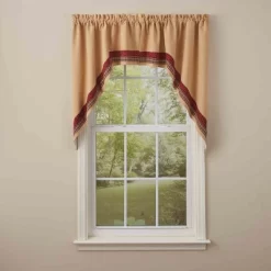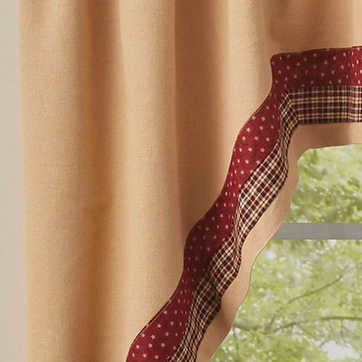 Accessorize your kitchen windows with this traditional country styled curtain swag. Features a plain beige ground with two lined bordering patterns of stars and a classic plaid pattern in red, black, and beige. Complete the vintage farmhouse look in any room of the house by layering coordinating tier pairs to create a warm and welcoming atmosphere.