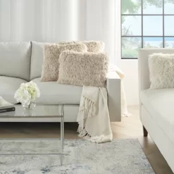 Snuggle up to the comfy, ultra-plush texture of this shaggy throw pillow by Mina Victory. With a perfectly simple, fuzzy front and velvety soft back, it adds just the right mix of functionality and style. Strips of slender, shimmering yarns add a delicate sheen to this modern design. This fluffy decorative pillow coordinates well with neutral throw pillows of various sizes and colors. Zipper closure for easy removal and cleaning, removable polyester insert is included. Recommend spot cleaning as needed using a gentle cleanser.